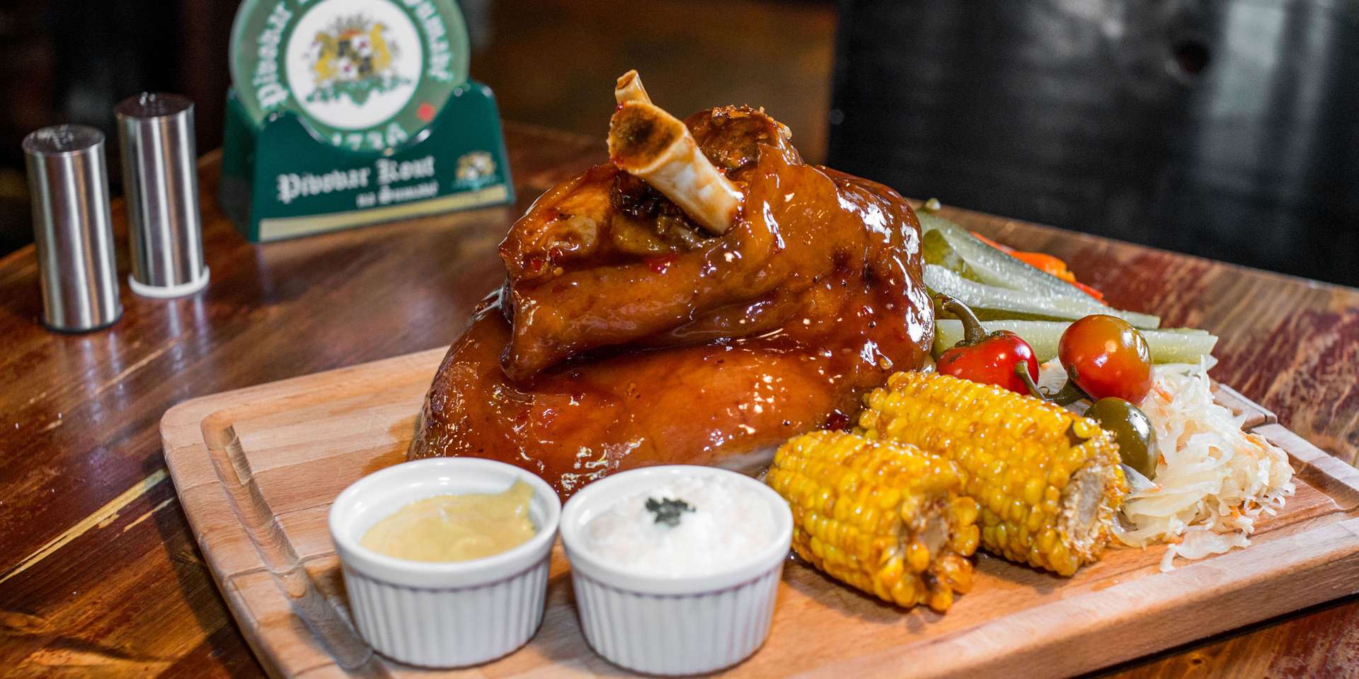Marinované grilované bravčové koleno alebo marinované grilované bravčové rebierka pre ozajstných jedákov. K tomu grilovaná kukurica, čerstvý chrumkavý chlieb, kapusta, nakladaná zelenina, horčica, chren a dve veľké šumavské pivá Kout.