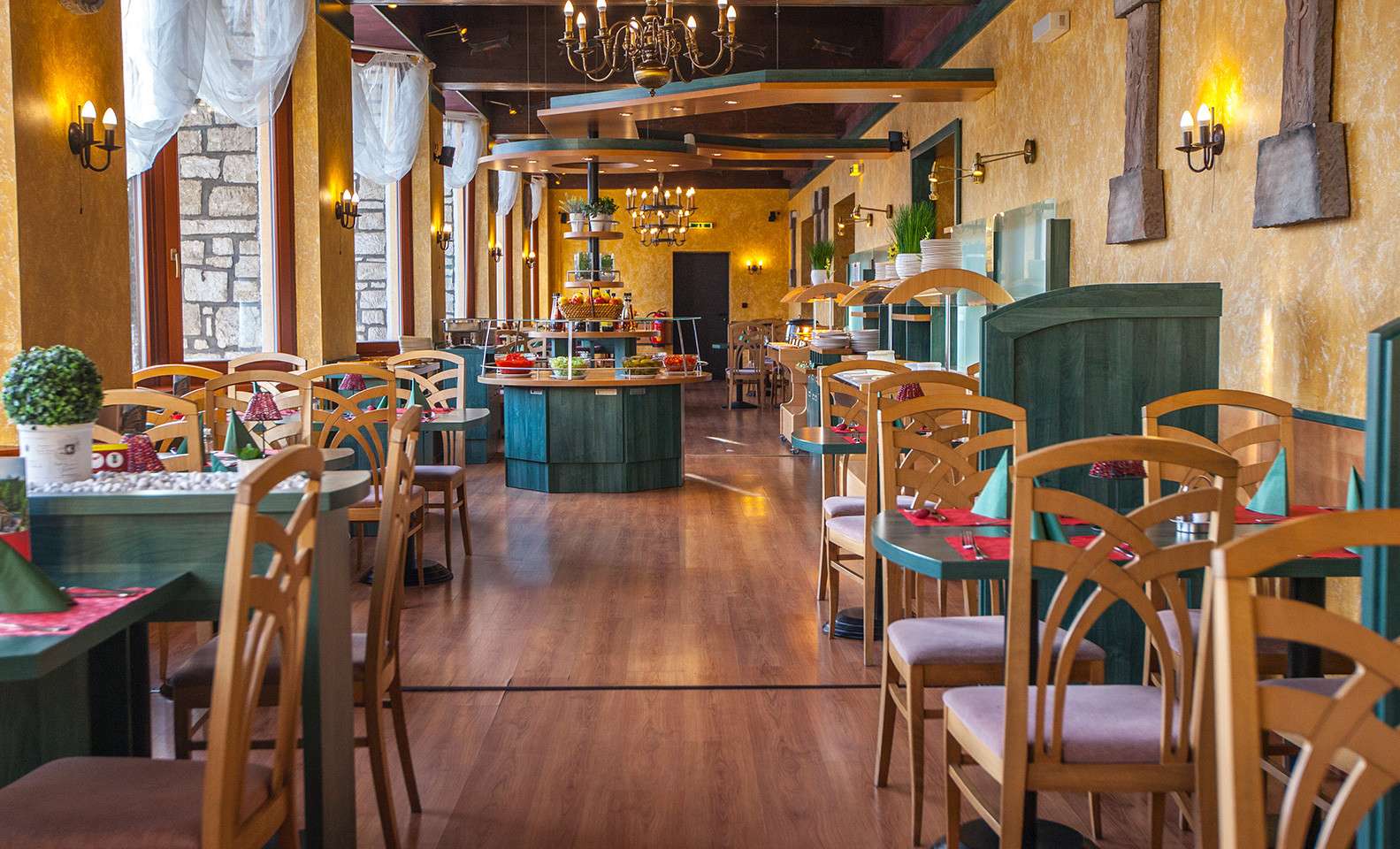 Vynikajúca kuchyňa hotela zaisťuje stravovanie formou polpenzie a plnej penzie v dvoch reštauráciách (menšia s kapacitou 60 miest, väčšia s 83 miestami). Priestor väčšej reštaurácie sa dá navyše rozdeliť na dva menšie salóniky a sálu a vytvoriť tak zázemie pre individuálne programy jednotlivých skupín. Súčasťou menšej reštaurácie je herňa, väčšia má k dispozícii bohato zásobený hotelový bar. K vonkajšiemu posedenie nabáda terasa s možnosťou grilovania.
