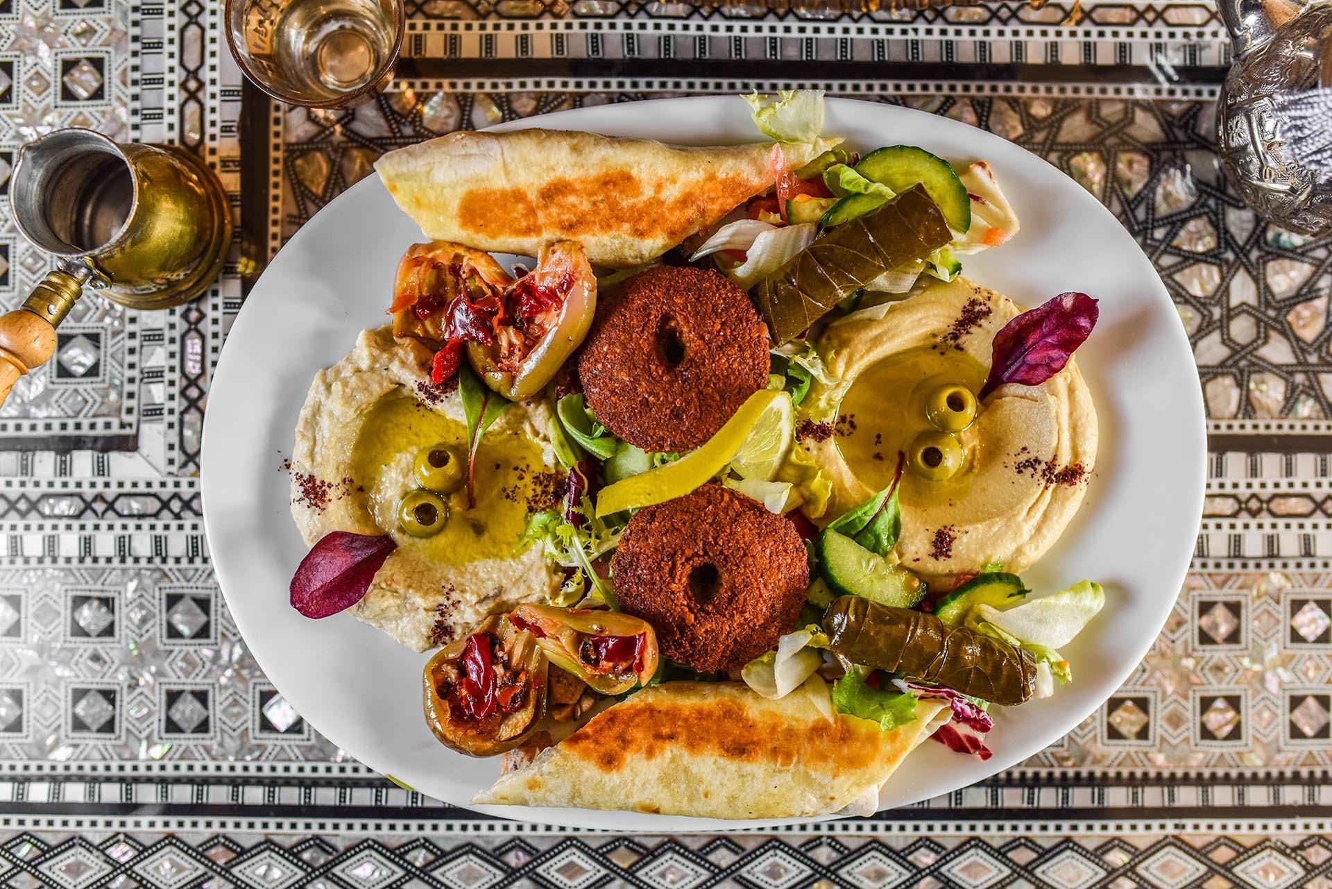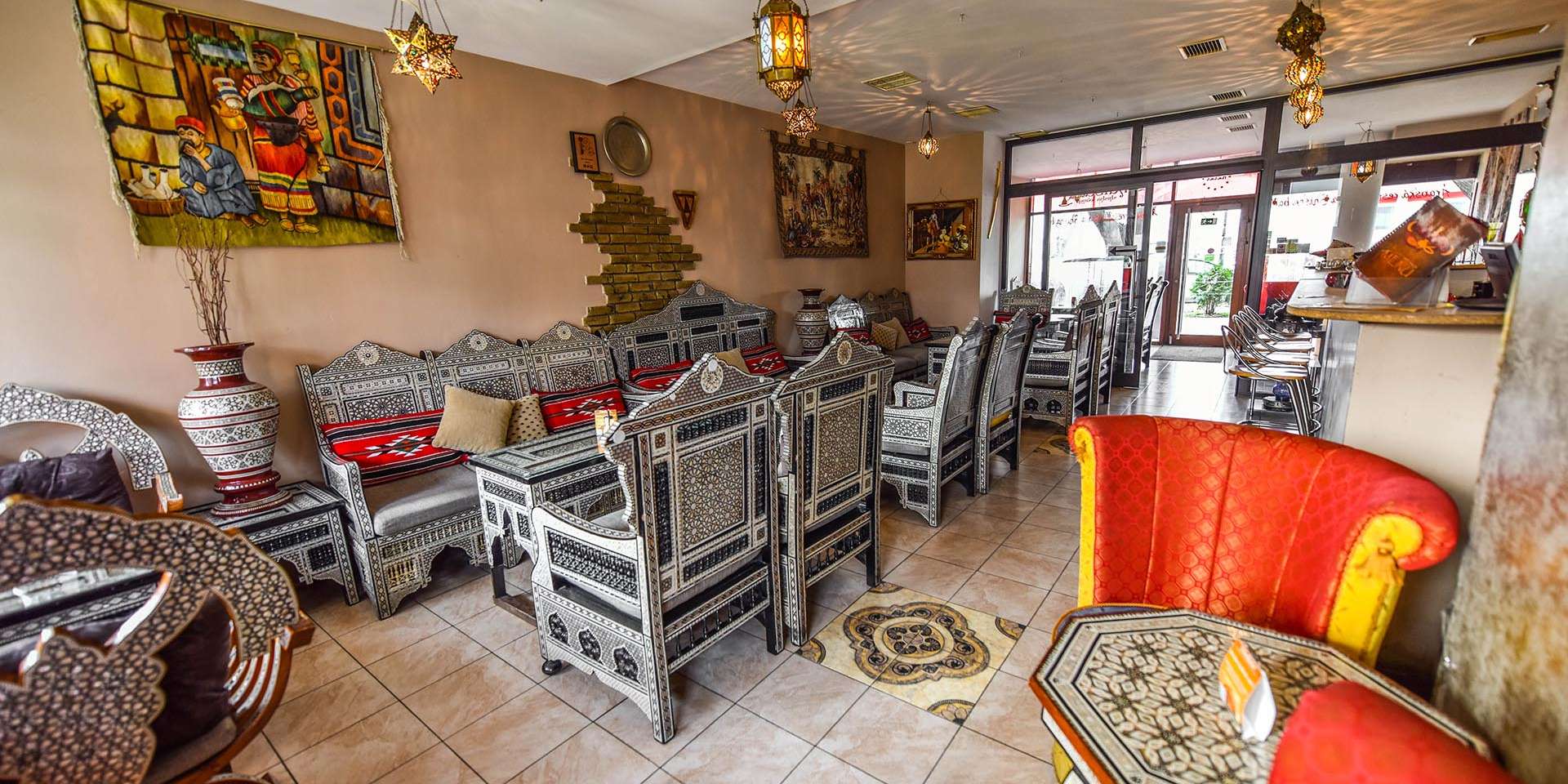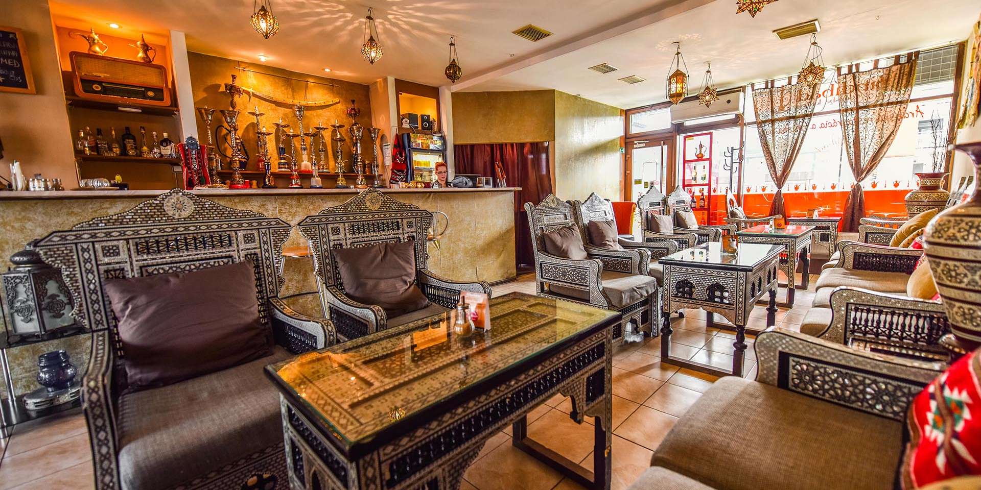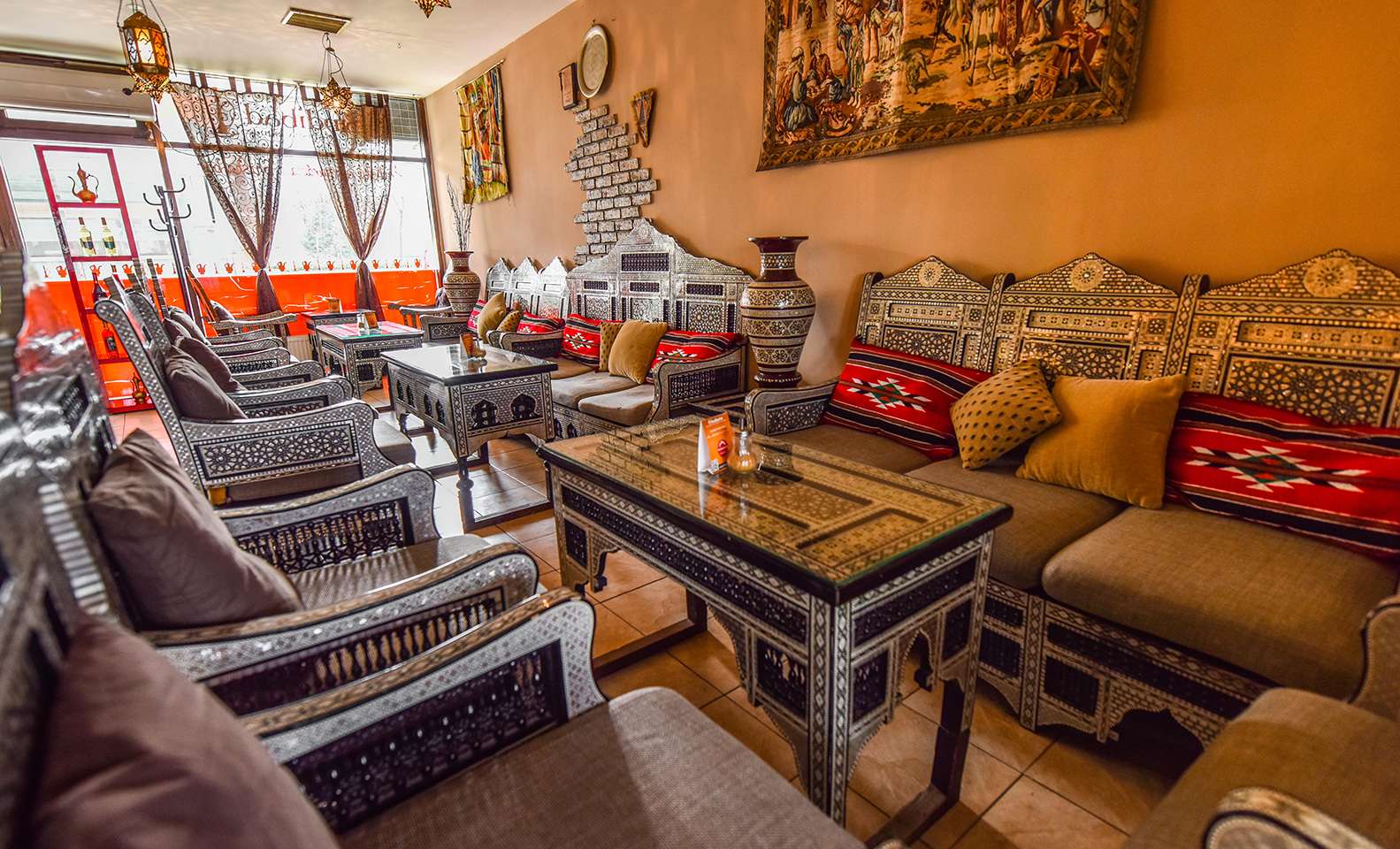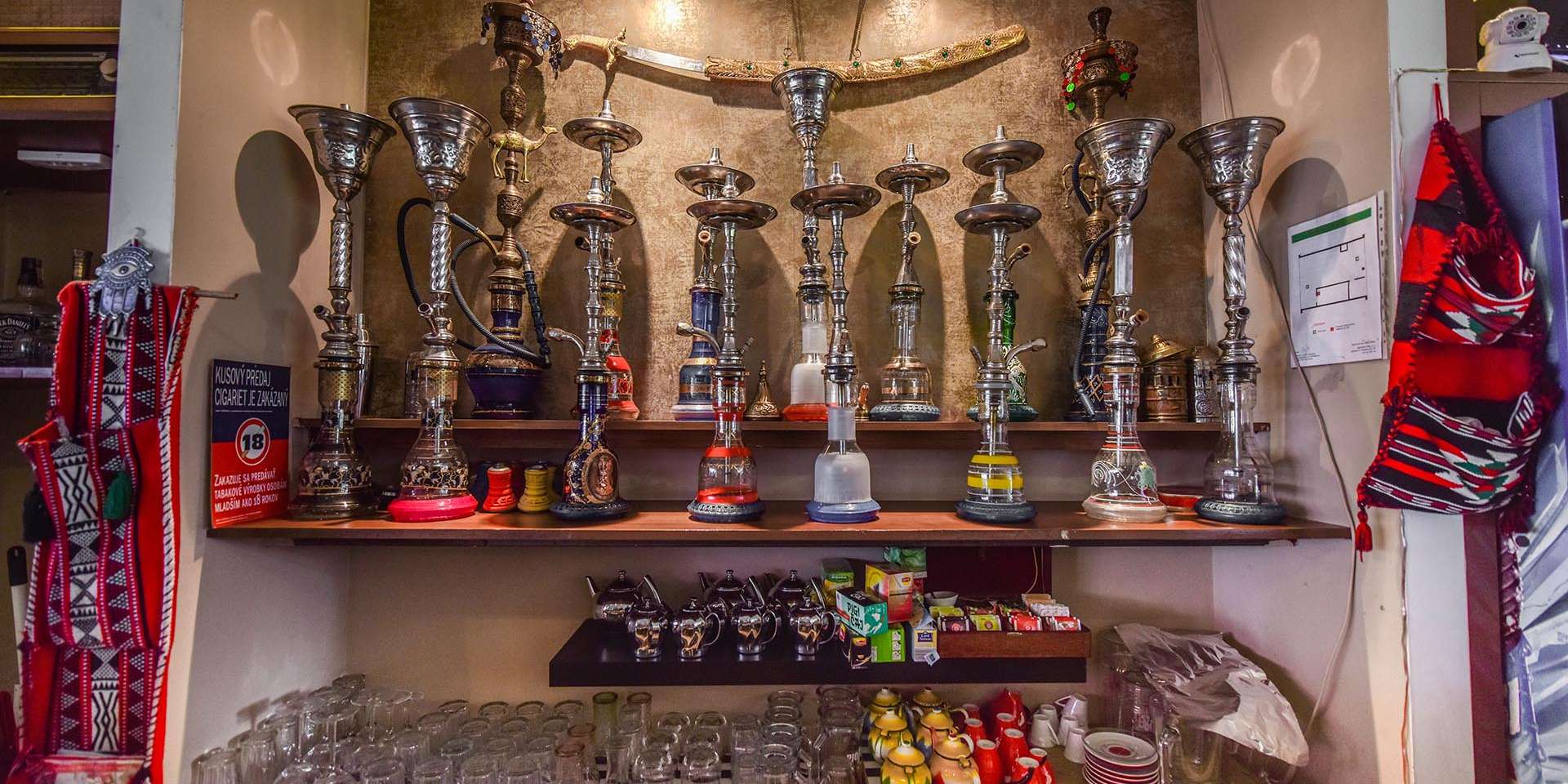 V reštaurácii vám okrem špecialí arabských krajín ponúknu aj vodné fajky z vysokokvalitného tabaku omamných vôní ako jahoda, aníz, ružový kvet, mixované ovocie...