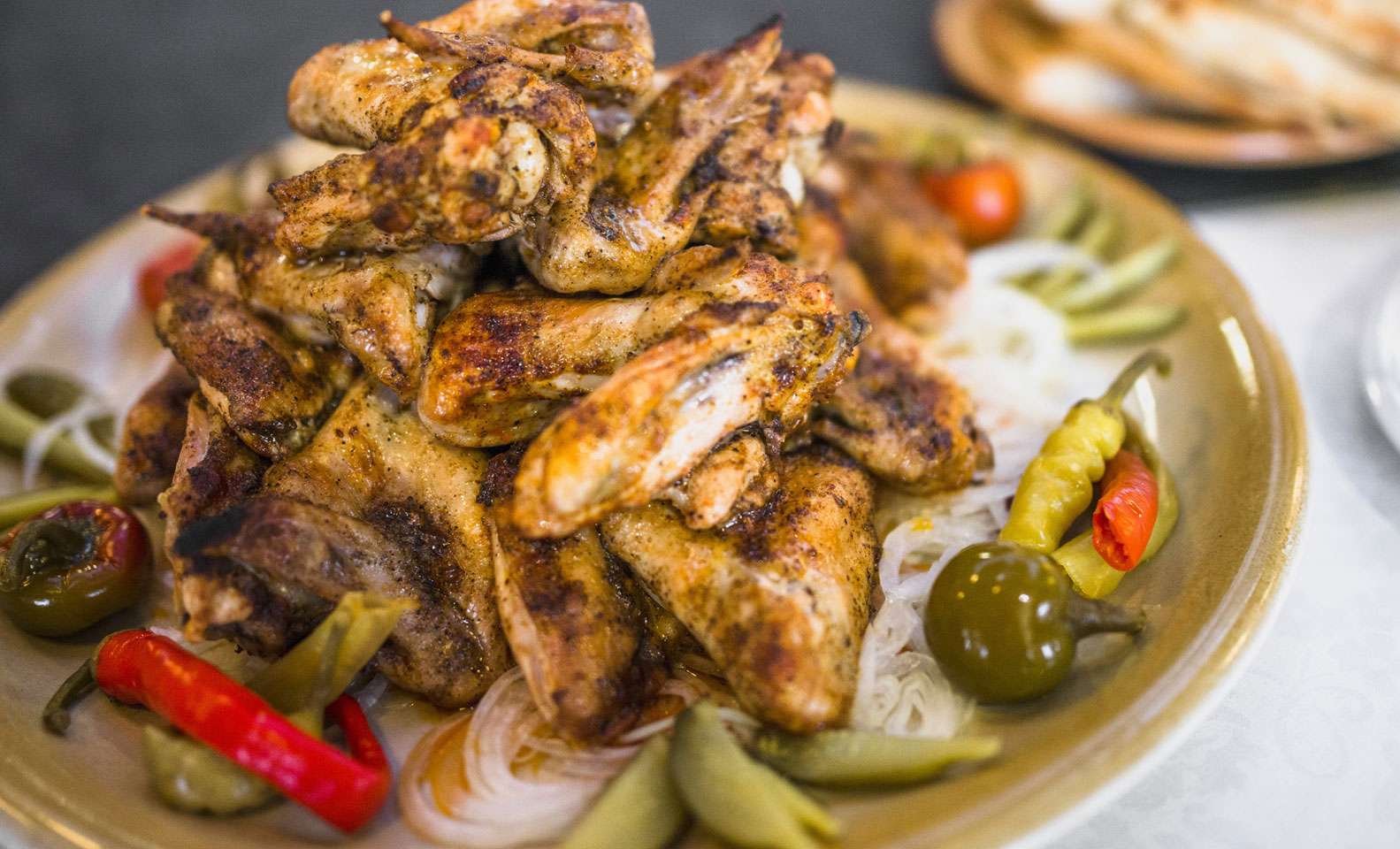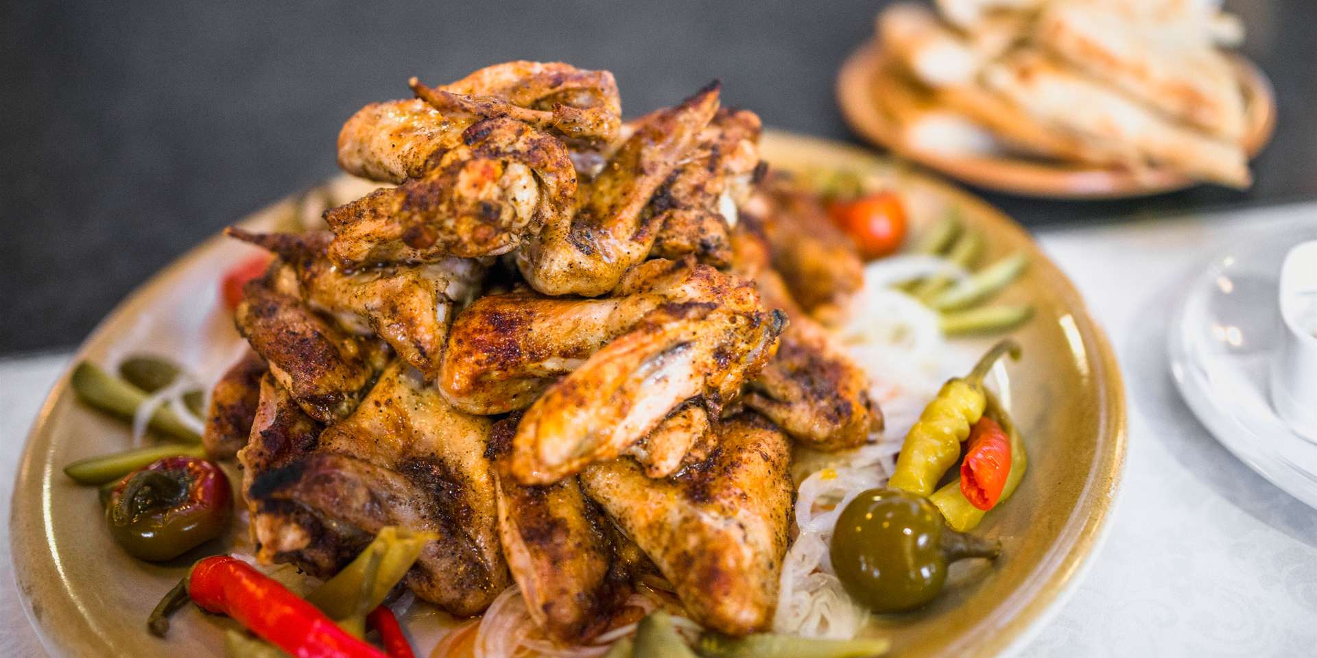 Jednoducho pochúťka na tanieri. Grilované kuracie krídelka s prílohou, zelenina, dresing a pečivo. Nezabudnite, že musíte splniť jedno jediné pravidlo a to - prísť s veľkým hladom.