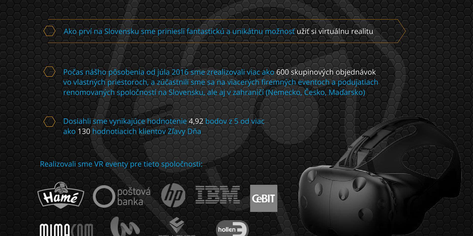 Zahrať si naživo Minecraft, stáť uprostred noci v areáli opustenej továrne a číhať na zombíkov, byť samurajom či ocitnúť sa na megalomanskej horskej dráhe, z ktorej keď vystúpite, tak sa vám budú triasť kolená? Zažite to a ešte kúsok viac v priebehu pár hodín vo virtuálnej realite.