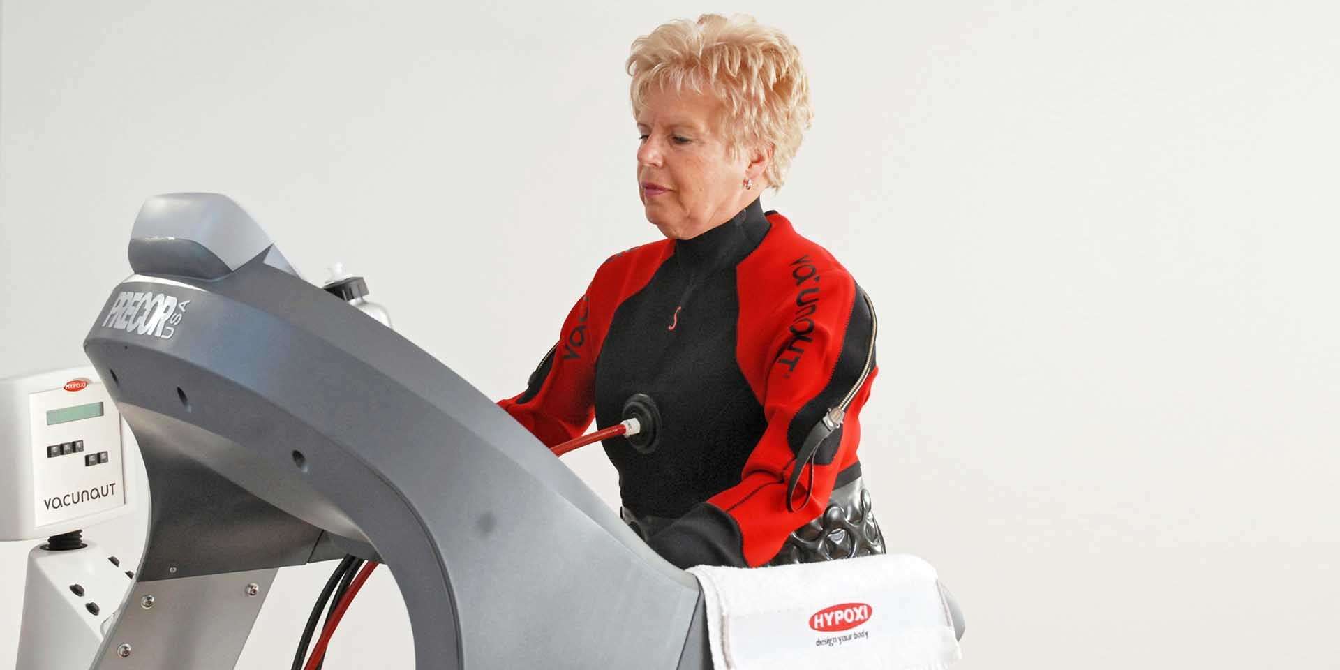 Vacunaut® rozpúšťa tuky presne tam, kde sú najnebezpečnejšie. A to na bruchu a na bokoch. Toto cvičenie sa vykonáva v špeciálnom vákuovom obleku na bežeckom trenažéri.