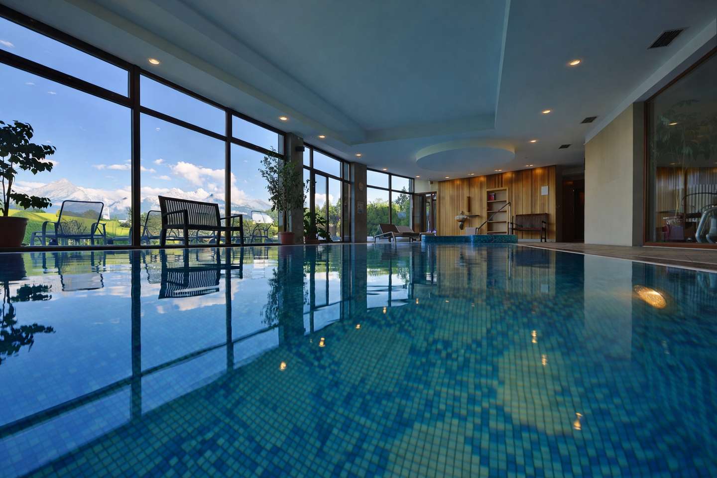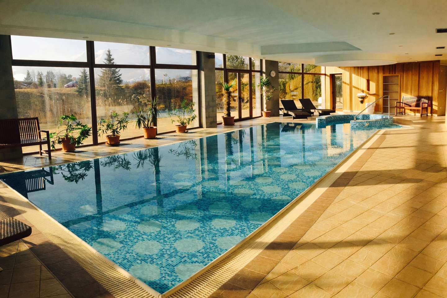 Vnútorný bazén s vírivkou a protiprúdom (4 x 9 m), teplota vody 30 °C.