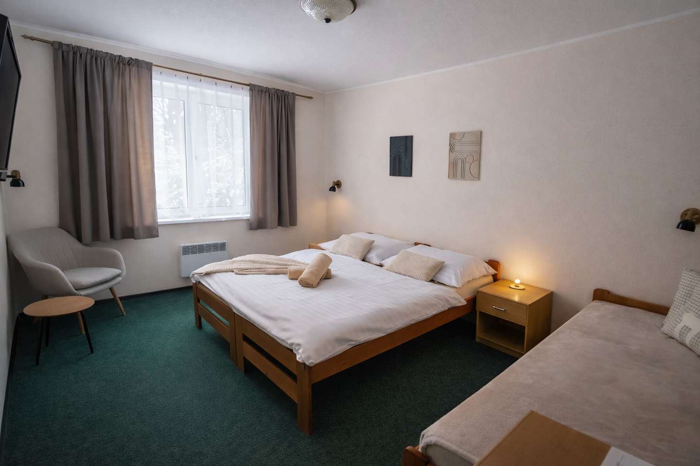 Televízor sa nachádza len vo vybraných izbách, pričom TV je hosťom k dispozícii aj v spoločenskej miestnosti alebo na vonkajšej krytej terase.