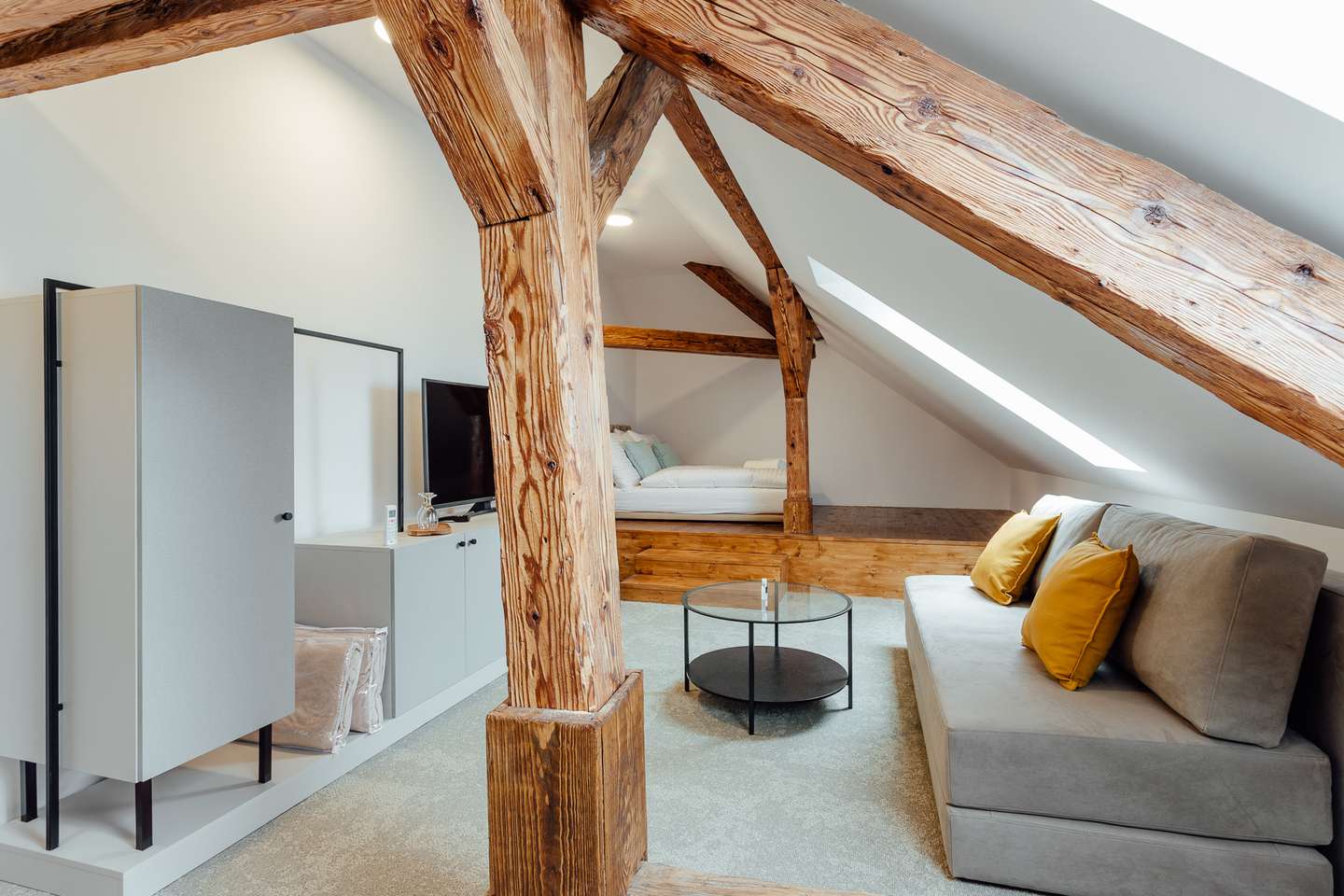 Izby majú vysoké stropy a vďaka veľkým oknám a skvelej orientácii sú svetlé a vzdušné. Na mieru vyrobený nábytok a starostlivo vyberané doplnky umocňujú pocit pohodlia.