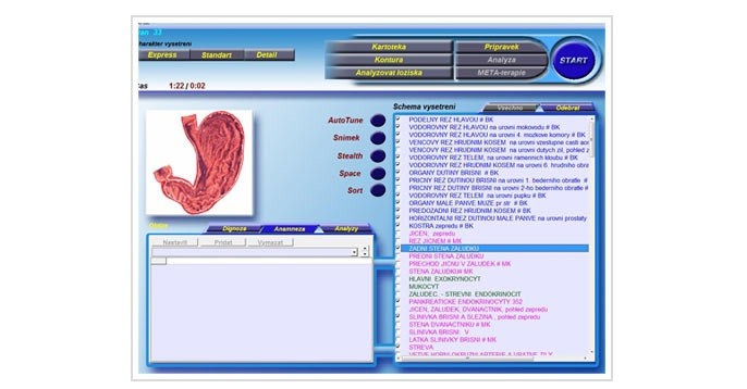 1. PRVÁ FUNKCIA DIACOMU - zistenie stavu orgánov a prítomnosť narušiteľov: baktérií, vírusov, parazitov, plesní ...Diacom v prvom rade dokáže zmerať momentálny stav kmitania buniek v našom tele. Po zadaní konkrétneho orgánu zistí stav jeho buniek a porovná ich s kmitaním zdravej bunky. Môžeme to porovnať so stavom, že sa pozrieme na našu hojdačku a vidíme, či sa hojdá optimálne, alebo jej kmity slabnú. Ak Diacom zistí, že biorezonancia sledovaných buniek je narušená, dokáže zistiť a presne určiť podľa zmerania frekvencie cudzích buniek, o aký typ narušiteľa ide. Väčšinou sú to baktérie, vírusy, parazity, plesne... Aj pozorovaním hojdačky dokážeme zistiť, prečo nekmitá optimálne - poškodené ložiská, iné tlmiace sily hojdania...