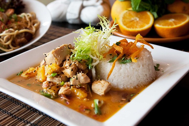 Čínske kura s omáčkou z čerstvých pomarančov a jasmínovou ryžou (450g)