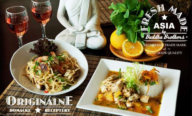 Len 9,99 € za najobľúbenejšie čínske kura s čerstvým pomarančom a lososové pšeničné cestoviny s domácky pripravenou tonkatsu - kokosovou omáčkou v centre mesta s najlepším výhľadom Buddha Brothers.