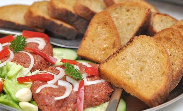 Ozajstná špecialita pre pravých gurmánov, tatársky biftek s hriankami a prílohami v Starohájskej pivárni len za 5,90 €.