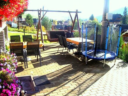 Vo vnútri penziónu sa pre Vaše ratolesti nachádza detský kútik s množstvom hračiek a hier. Vonkajší priestor na hranie ponúka drevený domček so šmýkalkou a pieskoviskom a aj tu majú hračky svoje miesto. Trampolína a detská hojdačka určite vyčaria úsmev na tvári Vašich malých ratolestí a Vy ich pri detských hrách budete môcť sledovať z pohodlia letnej terasy, kde sa budete dobre cítiť v objatí množstva kvitnúcich kvetov.